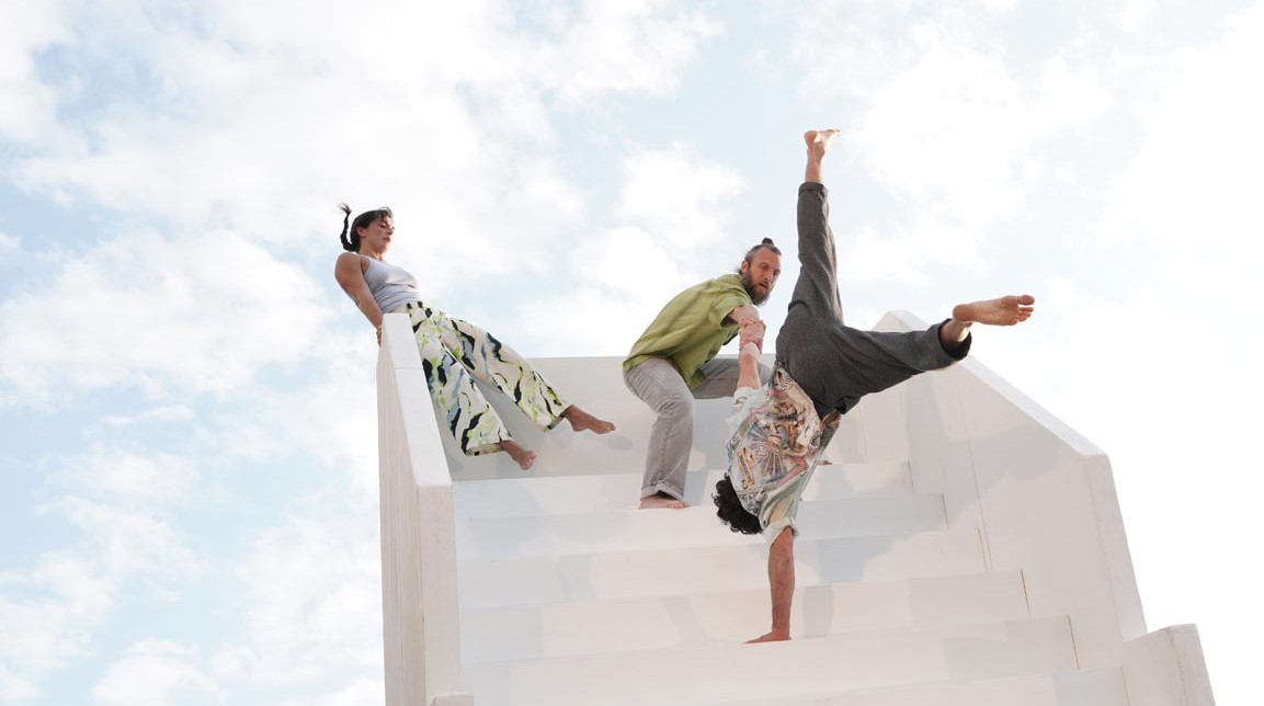 Gestrand op een scheve trap zweven drie performers in de ruimte. Ze zijn aangewezen op zichzelf en op elkaar. Het ene moment glijden ze bijna van de trap, dan weer hervinden ze hun evenwicht, tasten ze de grenzen af van deze verloren ruimte zonder houvast.